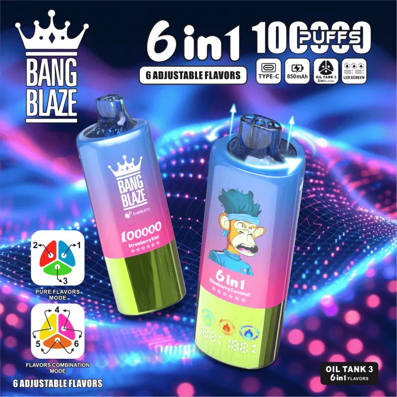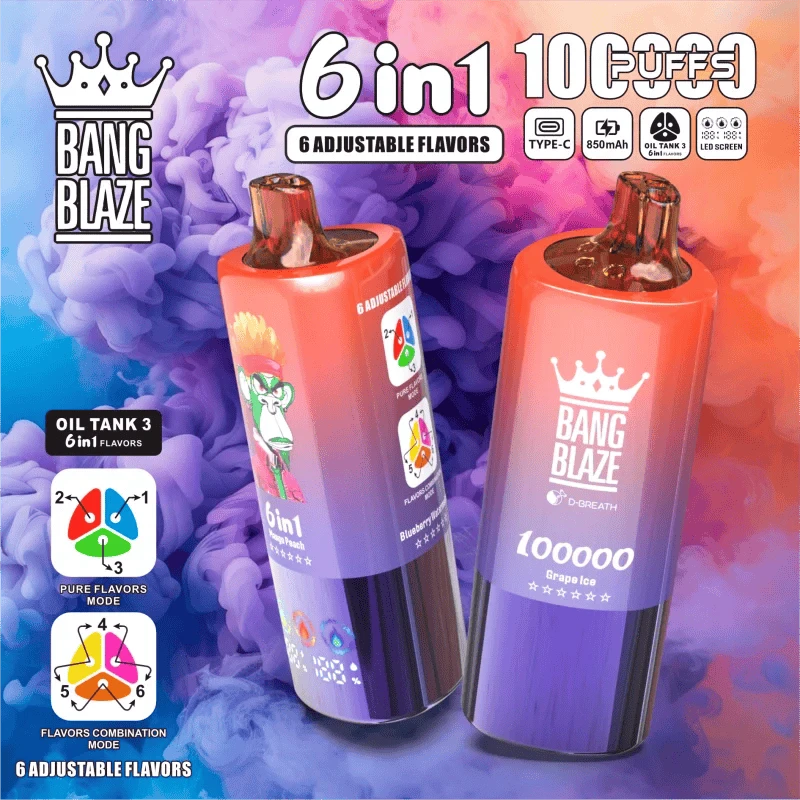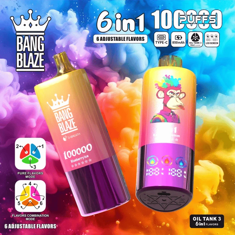 The Bang Blaze 100K is a revolutionary 6-in-1 disposable vape featuring a triple oil tank system, delivering 6 distinct flavors in one device. Choose between Pure Flavor Mode and Flavor Combination Mode to switch or blend flavors as you wish. With an 850mAh rechargeable battery, a Type-C charging port, and up to 100,000 puffs, it’s built for endurance and flavor satisfaction.