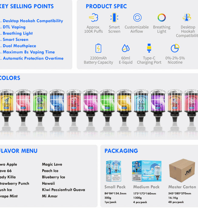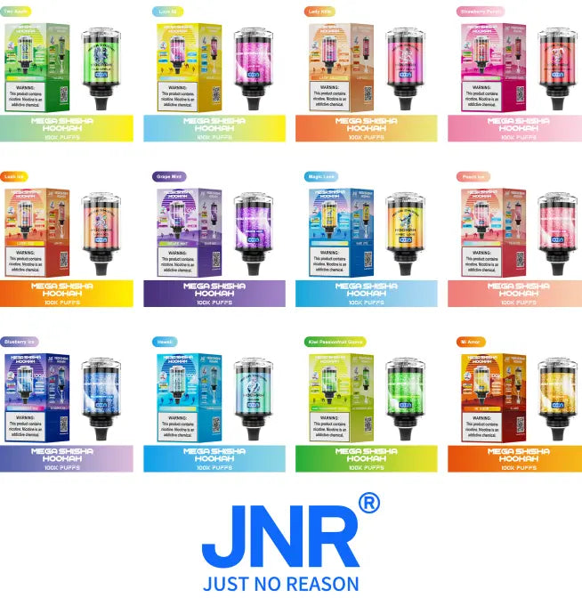 Available in 12 exciting flavors, the JNR Mega Shisha 100000 Puffs offers a wide range of options to suit your tastes, making it the ideal choice for anyone seeking a luxurious, high-performance disposable vape.