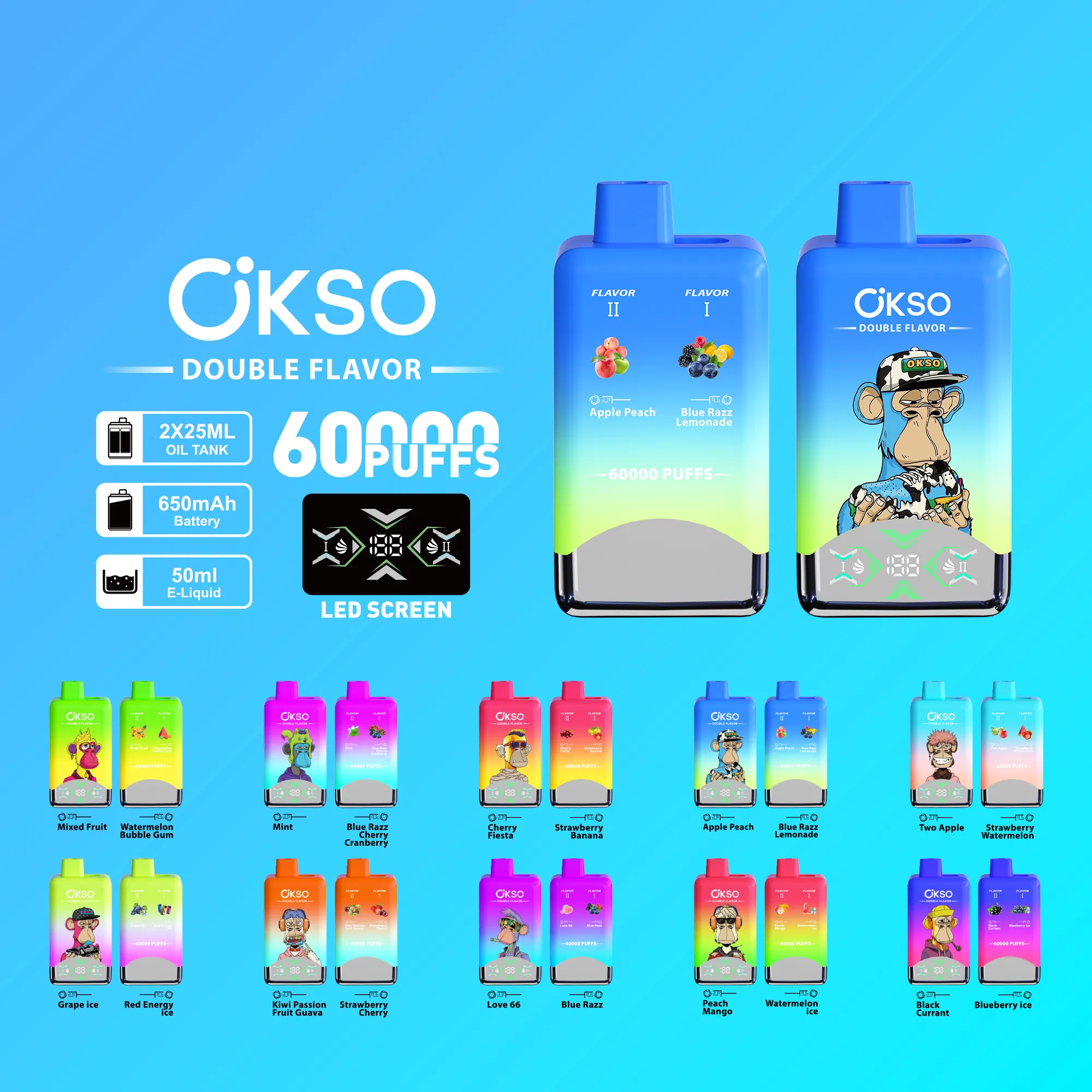 Indulge in the OKSO Double Flavor 60K and experience 60,000 puffs of vibrant, flavorful vapor. Get yours today for the ultimate long-lasting and delicious vaping experience!